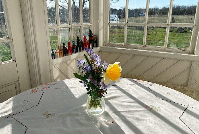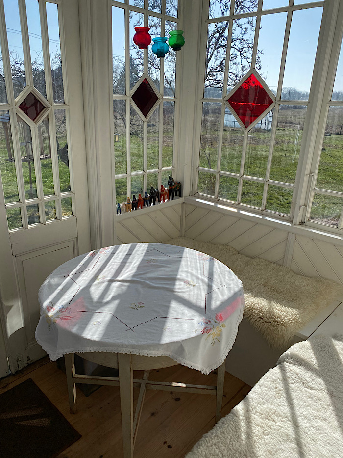 Vårduken ligger på fars bord och vi kan äta lunch här ute i någon dag till. Snart övergår detta till miniväxthus igen. Tomater och pelargoner står uppe i syrummet nu, men ska i vanlig ordning flytta ner hit för att vänja sig vid utelivet. Det är härligt med ett levande hem som ändrar karaktär i takt med årstidernas föränderlighet. Just nu njuter jag av det rena och avskalade i detta lilla smycke till utbyggnad. Förvaringen städades ut innan jag tog detta kort, men jag tänkte att det fanns utrymme för en hårdare rensning. Du vet hur jag är, jag gillar att rensa och organisera då och då och återkommer med all säkerhet till dessa bänkar en annan dag. Idag ska jag bara sitta på dem i pauserna. Gott så.