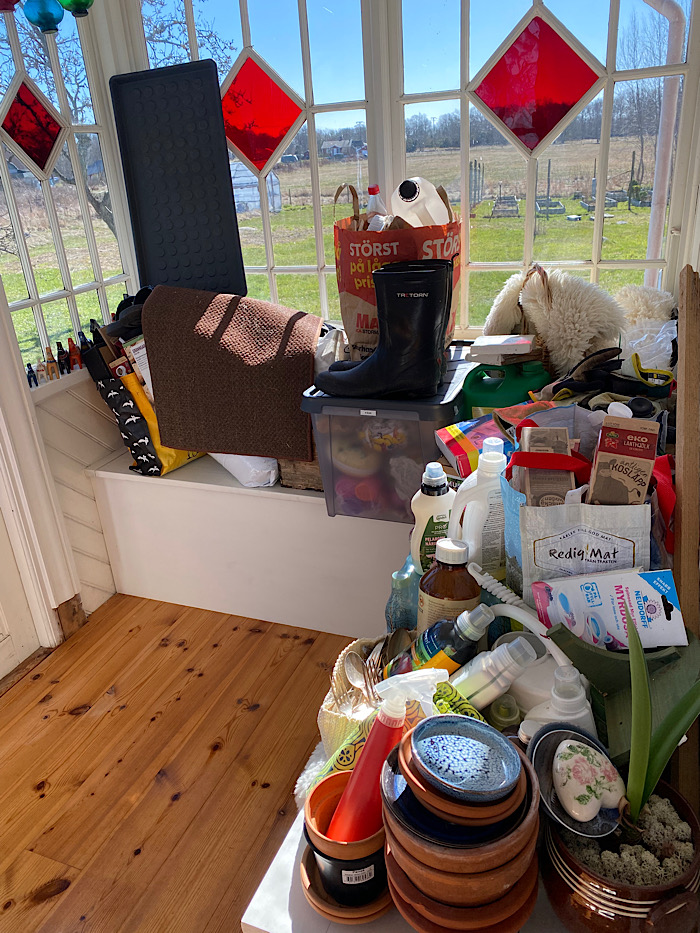 Varje höst är det samma sak. Verandan blir till något slags kombination av lagerlokal och kylskåp. Vi använder inte längre den vägen in i köket, men utrymmet utnyttjas precis lika mycket som det gör under sommarhalvåret. Den ser bara inte lika trevlig ut. Det får vara så, jag tar tacksamt emot varje extra kvadratmeter som erbjuds i vårt lilla hem. I år var jag lite senare på bollen än vanligt på att vårstäda, men visst har det varit ovanligt kallt och ruggigt? Eftersom verandan är oisolerad, även under golvet, så fluktuerar temperaturerna mycket. Skiner solen får vi ett eget litet paradis där inne på våren även om det är kallt ute, men blåser det och är kallt så känns det inte som att fönstren och brädorna skyddar särskilt mycket.