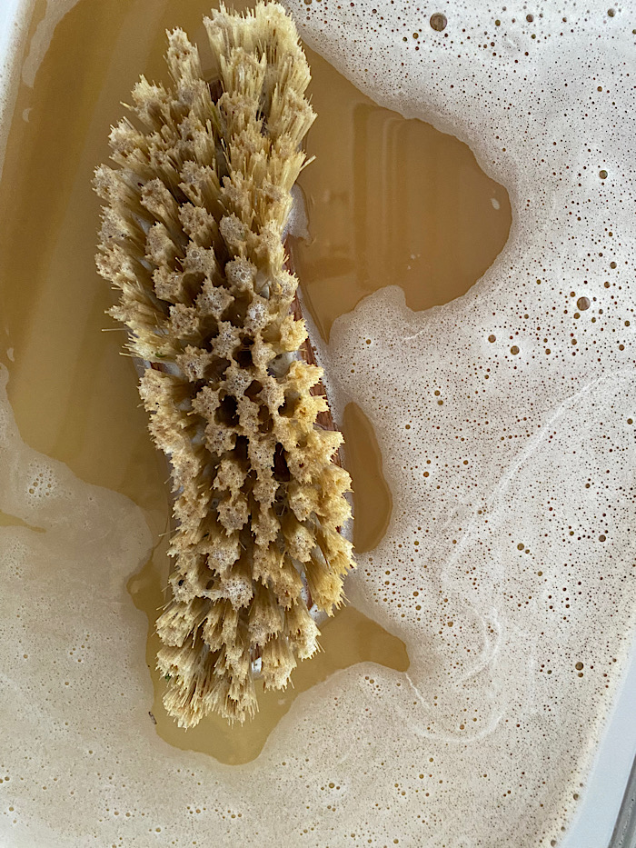 I förra veckan var det iallafall dags att hälla såpa i fotbaljan tillsammans med kallt vatten och börja skura. Jag jobbar flödigt med både såpvatten och ”avtorkningsvatten” eftersom det rinner rätt igenom. På övervåningen funkar inte detta förhållningssätt. Visserligen ger såpan färg till vattnet, men jag kan säga att det var rätt skitigt.