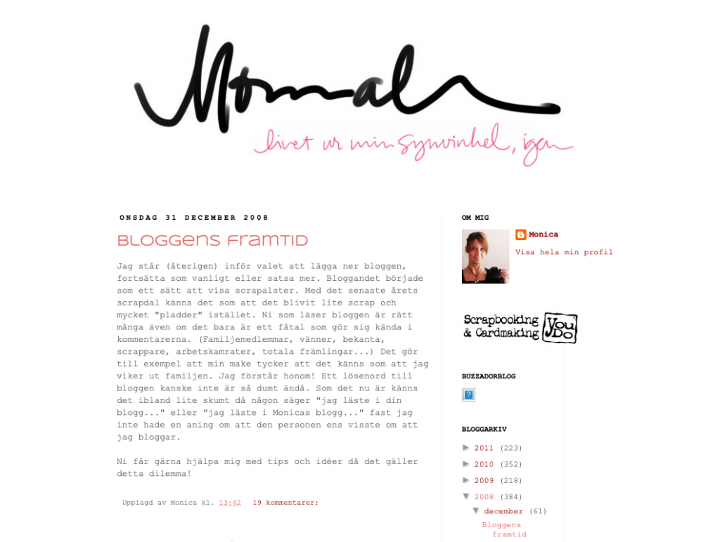 Det här är min fjärde blogg, men både den första och den andra försvann då blogsome gick upp i rök. (Här kan du dock läsa inlägg från den andra bloggen via Wayback Machine. Kanske borde jag kolla länkarna till mina gamla scrapvänners bloggar? De flesta av dem är inte längre aktiva.) Dessa bloggar, och även den tredje, handlade mest om familjeliv och scrapbooking och till viss del kortmakeri. När You Do lade ner ändrade min blogg karaktär, men redan innan dess hade jag börjat skriva mycket mer om annat än mitt pysslande. Numera vet jag inte riktigt vad jag ska kalla mitt fokus. Du som brukar läsa här vet att jag inte lämnar någon kvalitetsgaranti. Ibland får du läsa om min stora familj, ibland lämnar jag redovisningar om mitt planttanteri, ibland får mina existentiella tankar ta plats och ibland gräver jag ner mig i funderingar runt aktualiteter. Lusten styr definitivt, men det är nästan bara dagar då jag absolut inte har tid som jag inte skriver några inlägg. Jag ser bloggen som min personliga terapeut. Det låter kanske konstigt, men skrivandet är terapeutiskt för mig. Då jag anonymiserar mycket innebär det att jag inte alltid vet vad som hänt som föranlett gamla blogginlägg. Det är helt okej, jag ser det inte som något stort problem. Jag gillar varken att vika ut mig själv eller personer som står mig nära, så smaskiga detaljer får du leta efter i andra bloggar. Jag har ändå som mål att inte skönmåla mitt liv och hoppas därför att detta är en plats där du som läser kan känna dig trygg med att förstå att jag är en helt normal människa med både styrkor och svagheter, en människa som strävar och gör mitt bästa för det mesta. Ibland tycker jag också att alla är idioter. Det bjuder jag på. Och en vacker dag hoppas jag också att foton får ta mer plats igen här, något som inte varit fallet sedan min kära kamera började krångla. Det är stor skillnad på kvaliteten på iPhone-bilder och Canon-foton.