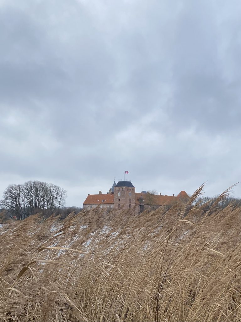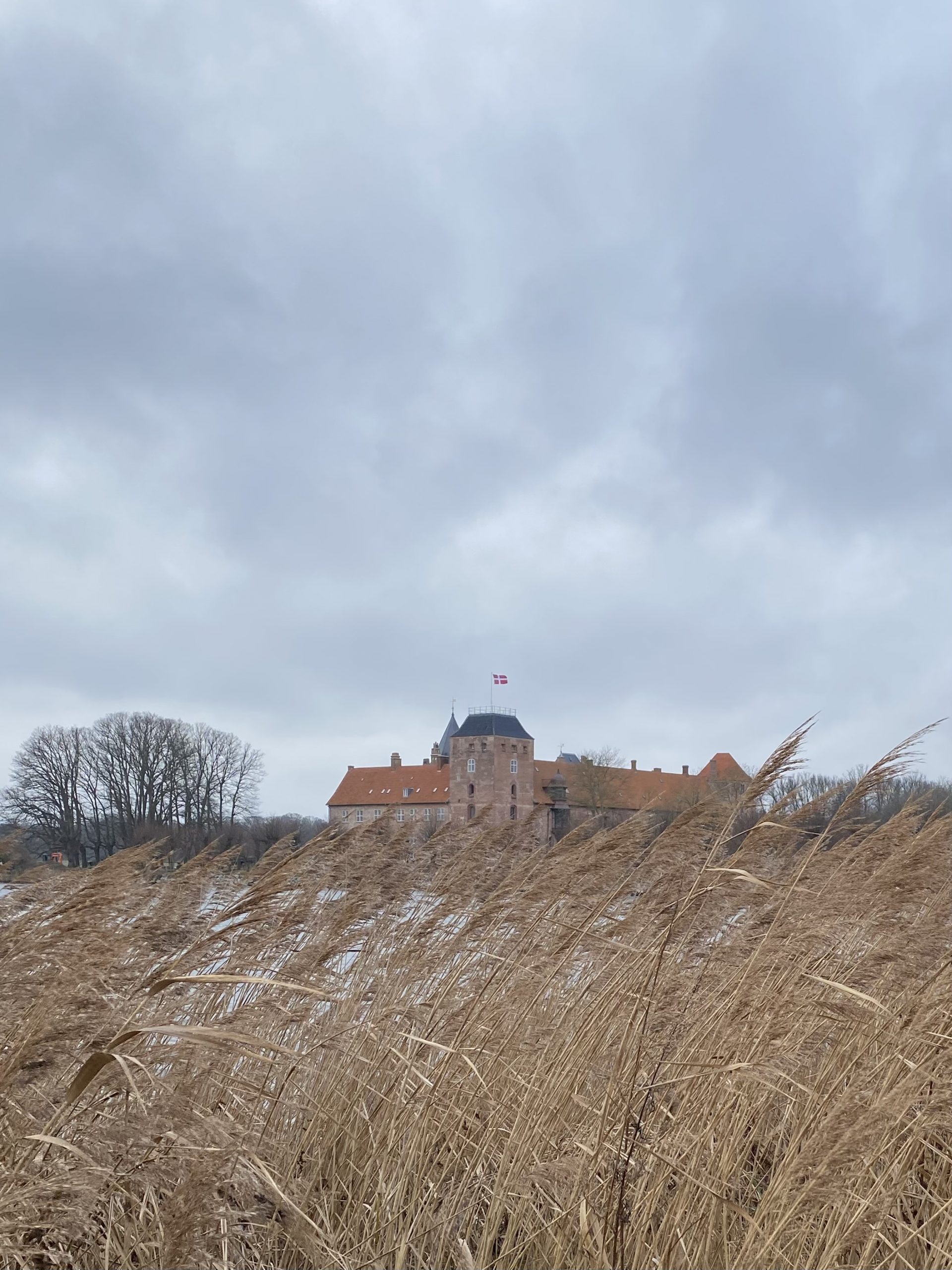 Aalholm slot ligger så fint på andra sidan vattnet. Här stod från början en borg som byggdes på 1100-talet. Tänk att slottet ännu lever och blomstrar idag, 2025. Det fick faktiskt förfalla ända tills 1884 då det helrenoverades. Här kan du läsa mer om hur jordbruket drivs idag och man kan också hyra in sig. Dessutom kan du se långt bättre bilder och en drönarfilm som visar ett hur fint det verkligen är.