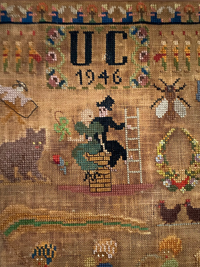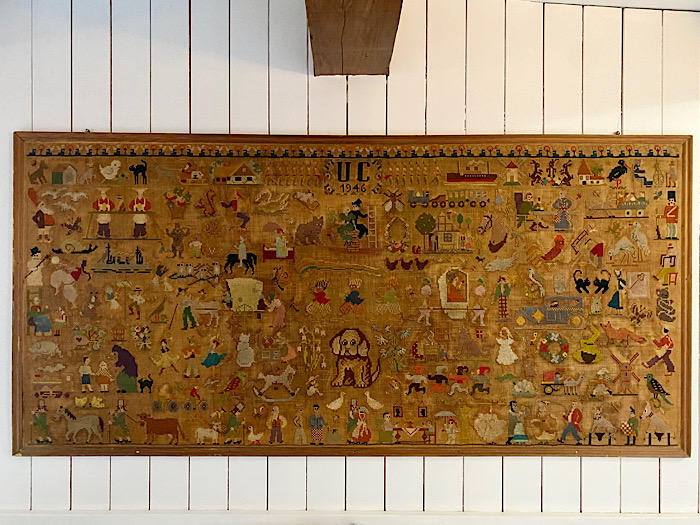 Efter att ha sovit gott på hotell i Sakskøbing (pga renoveringsprojekt var detta smidigast) och ätit den obligatoriska och mycket goda hotellfrukosten var det dags för en utflykt med de unga tu. Jag vill bara först visa det fantastiska broderi som hängde utanför vårt rum i korridoren. Alltså, wow! Snacka om skatt. Det var så roligt att studera detaljerna och fundera över hur det kom sig att UC broderade detta jättekonstverk och varifrån dessa mönster kom. Egenkomponerade?