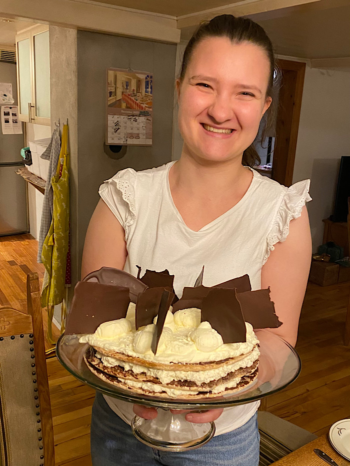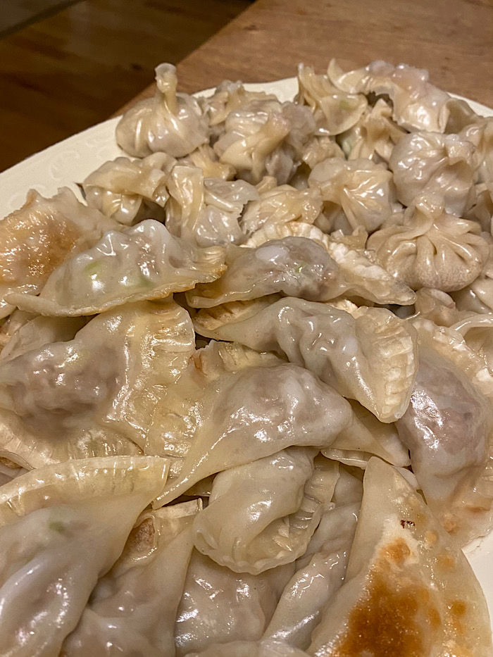 Eftersom vi kommer att missa både dotterns 25-årsdag och jul hade vi bestämt oss för att fira födelsedag på fredagen och jula lite extra på lördagen. Vår familjetradition har alltid varit att fira dotterns födelsedag genom att göra dumplings tillsammans. Varför bryta en uppskattad och välfungerande tradition? Vi hackade en massa ingefära, vitlök och annat och blandade och fixade och stod till slut med ett stort fat dumplings. Vi brukar blanda den ”stekångade” metoden med att ångkoka. Båda är goda och som med mycket annat är det i kombination med såsen som det blir riktigt gott. Schwarzwaldtårta var önskad, så jag hade förberett bottnar och dekorationer hemma. Maken fixade det sista och så hjälptes vi åt att montera ihop allt. Vi klämde ner varsin bit efter att ha spelat spel i några timmar och som alla vet gick det bra trots att vi egentligen var mätta. Efterrättsmage är nämligen en grej.