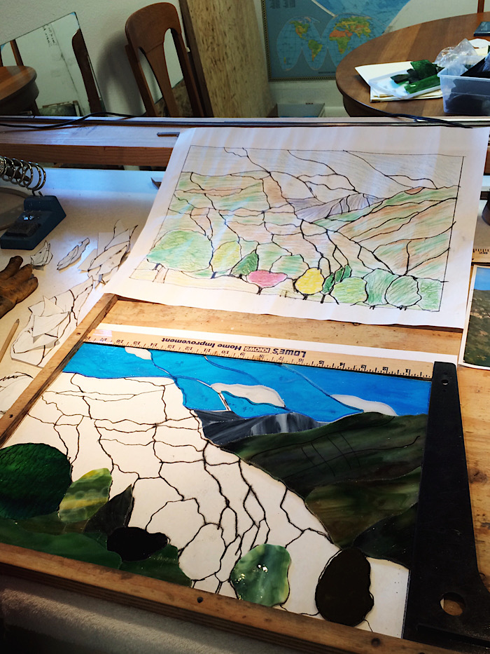 Så här jobbar Mark Bigelow. Motivet behöver rensas från distraktioner och för små detaljer. Alla träd i motivet finns på riktigt, även om de inte är ”true to size” och andra träd och hus rensats bort. Vid den här tidpunkten hade allting ”spikats” i samråd med våra grannar/vänner och Mark letade rätt bitar bland sitt glas. Motivet föreställer vår utsikt från sovrumsbalkongen, så för att få rätt bilder att utgå ifrån hade det smugits och smusslats och fotograferats i hemlighet. Hahaha, vilken grej!