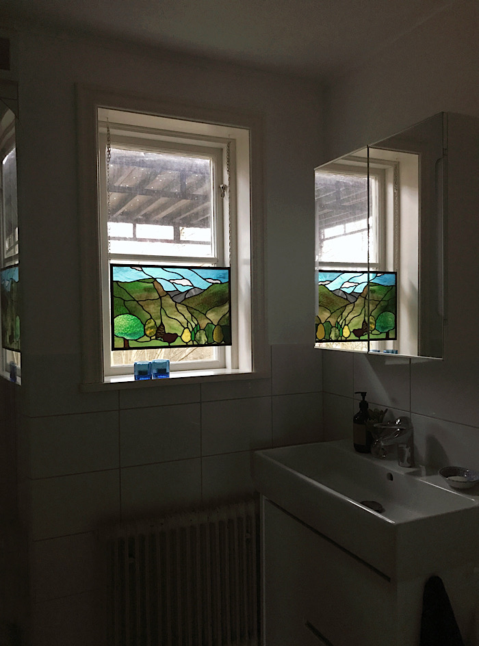 Vi var i Bredavik då maken packade upp sin dyrbara last. Jag var så lycklig och tacksam, inte minst för att transporten hade gått bra. Längst upp ser du mig, minst sagt mosig. Kunde fortfarande inte fatta att vi verkligen hade fått denna gåva. Fönstret hängdes upp så fort badrummet blev färdigt. Vid det tillfället stod fortfarande byggställningarna längs hela baksidan och fönsterkupan med övre toan och ”gästskrubben” höll på att byggas, så vi hade inte flyttat in än. Så fantastiskt perfekt i storleken för att bli ett insynsskydd. Jag hade mina funderingar över att ha ett konstverk av den här klassen på toa, men tycker faktiskt att det är perfekt! De flesta besökare får möjlighet att uppleva det i lugn och ro och själva får vi njuta av konstverket under alla tider och årstider, dag efter dag. Jag älskar det.