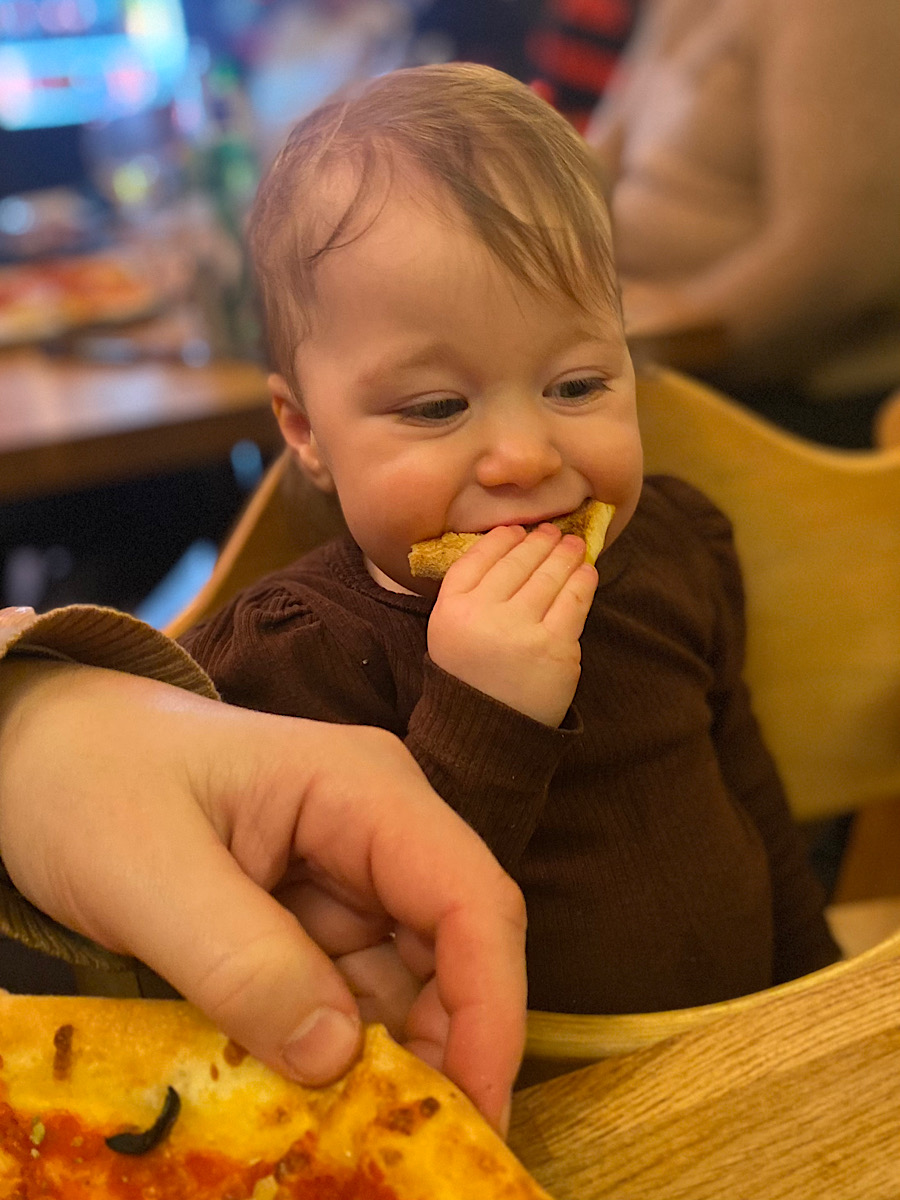 Efter några timmar for vi vidare mot Pizzeria da Gigi där dottern och svärsonen bjöd oss på middag. Vilket mysigt ställe! En ”äkta” italienare som bjöd på riktigt bra pizza. Det fanns även glutenfri pizza, men jag lyxade till det med entrecote och gorgonzolasås. Mmmmm. Vi blev sittande länge och hade det riktigt bra. Jag är glad att dotterdottern är så ”lätt” att ha med sig på offentliga ställen. Hon är social och hejar och interagerar med folk och det bjuds på leenden från alla håll. Pizzan funkade mycket bra på henne också.