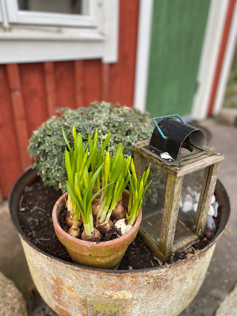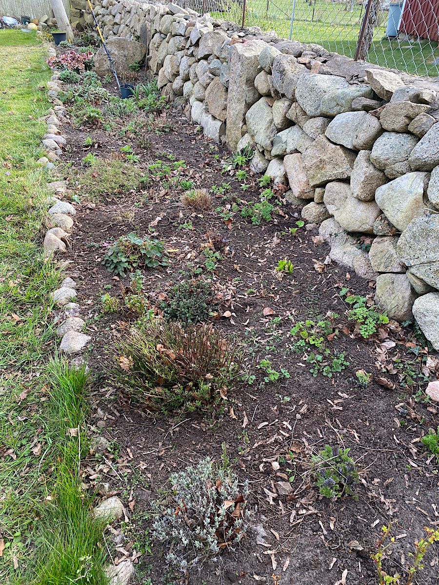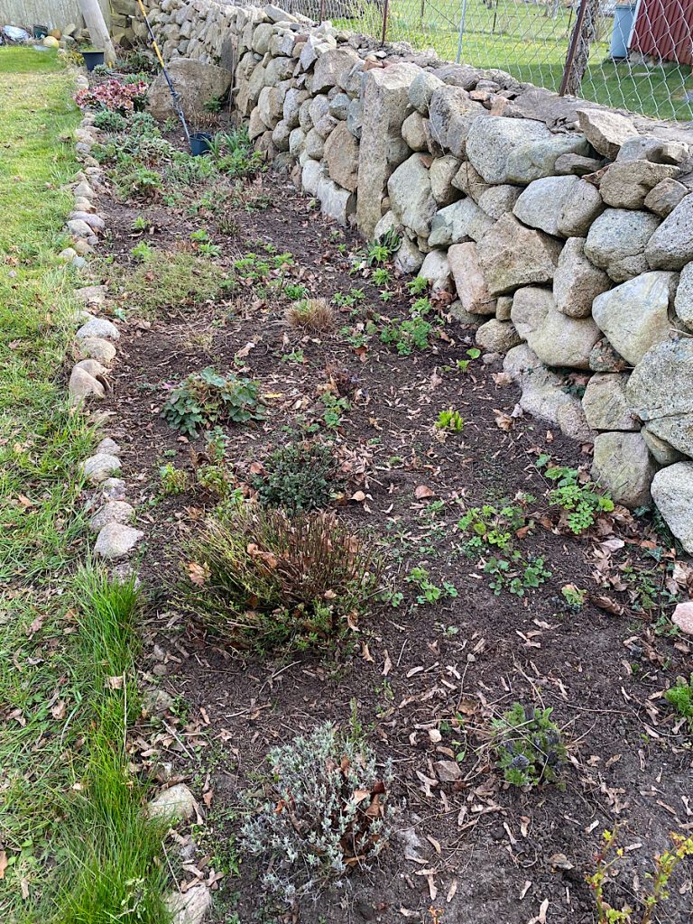 Nu har jag äntligen tagit tag i att rota fram allt det som växer i perennrabatten. Träffade grannarna över stenmuren (svägerskor som bor i de båda husen på ena sidan vårt hus). Vi kunde konstatera att nu är tiden då man börjar inse att man har grannar igen. H sa ”jag tänkte att jag skulle rensa i mina rabatter då du börjar”. Egentligen tror jag att båda dessa grannar har bättre koll, för båda har jobbat och jobbar med blommor och trädgårdar av olika slag. Efter en stund kom sedan en av de manliga grannarna och sa ”när ni började klippa gräset i lördags sa jag att nu var det fritt fram att klippa”. Hahaha, nu har vi alltså blivit trädgårdsinfluencers. Helt ofrivilligt och med väldigt lite på fötterna.