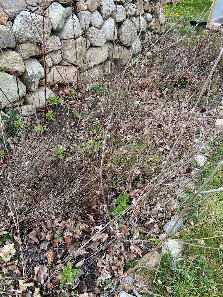 Hej, hej, kaos! Efter att ha rensat alldeles för tidigt för några år sedan har jag låtit riset stå lite längre för att skydda mot kylan. Inte ser det så fint ut, men å andra sidan är det inte fint efter upprensningen heller. Nu ska ju allt ta sig och börja ta ton igen. Jag försökte inventera och kunde konstatera att det mesta klarat sig denna milda vinter, men somligt verkar inte visa någon som helst växtkraft.