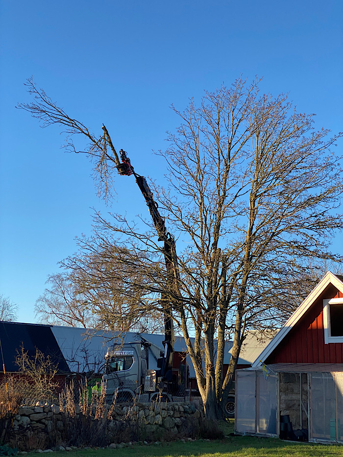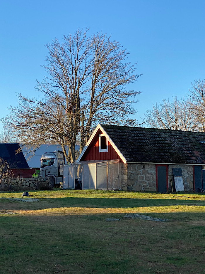 Igår eftermiddag när vi kom hem möttes vi av detta (titta lite mer noggrant till vänster om tomatkuvösen). Våra kära grannar talade redan förra hösten om att den vackra lönnen på deras gårdsplan skulle bort. Den har varit ett orosmoment för dem, inte minst pga risken den utgjort för deras lada, vår lada och deras bostadshus. Träd i all ära, men uppnår de en viss ålder och storlek är det svårt att bortse från fallande grenar och osynlig röta.