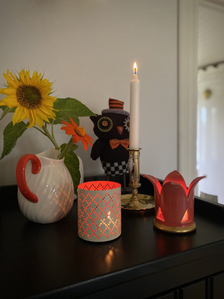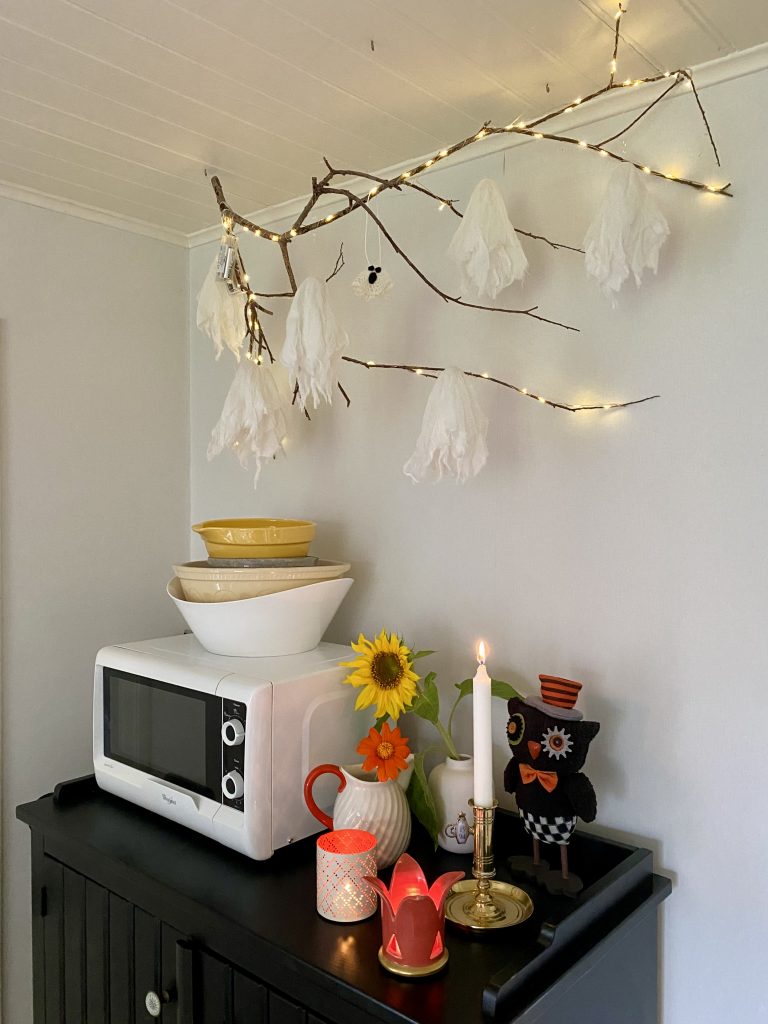 Under några veckor kommer jag att bo inne i Karlskrona hos mina svärföräldrar. Svärmor är ute på äventyr och jag kommer att bo hos svärfar under tiden. Maken blir kvar hemma hos fjäderfäna, men vi kommer naturligtvis att träffas ändå. Innan jag blev skjutsad in till stan fixade jag till ljusgrenen och plockade fram vår fulsöta Halloweenuggla. När jag flyttar hem igen är vi nämligen bara några dagar från Halloween och sedan får inte spökena vara med längre. Men visst är de lite söta? Förra året fick jag två nya gullisar av lillastesyster, riktigt spökiga spetssystrar. Säga vad man vill om Halloween (jag säger mest att det inte är min favorithögtid), men amerikanerna vet hur man håller sina hem och trädgårdar levande genom att dekorera efter vilken tid på året det är! Detta har jag verkligen tagit med mig.