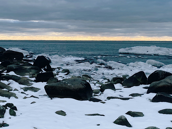 Efter bergsbilderna är kanske denna vy inte särskilt imponerande, men jag kan lova att det var otroligt vackert. Vattnet har skapat isskulpturer över stenar som ligger ovanför ytan längs med hela strandremsan. Jag hade inte kameran med mig och mitt sällskap hade eld i baken, så jag kunde inte riktigt fånga allt det vackra. Jag minns i hjärtat och du kan kanske tänka dig ungefär hur det såg ut..