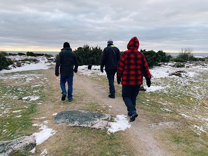 Våra vänner frågade om vi ville hänga med på långpromenad ute i naturreservatet och det tackade vi inte nej till. Med två minusgrader och nära 20 m/s i byarna var denna promenad ingenting för veklingar. Vi var alla påbyltade i lager på lager och hundarna var i himlen. Jag har sällan sett så glada fyrbeningar. De gillade snön, till skillnad från våra hönor som knappt sträckt ut näbben utanför hönshusdörren om det legat snö på marken denna vinter.