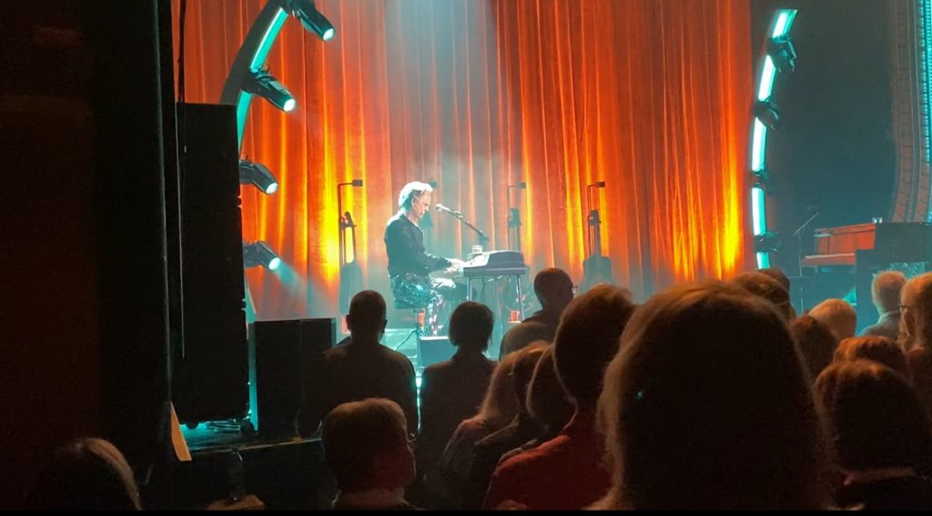 Dagens huvudperson var ensam på scenen i två hela timmar. Förvisso hade han en man som hjälpte honom fixa lite med instrument och mikrofoner, men annars var det verkligen Bara Orup. Herr Eriksson är född 1958 och har sålunda nått den aktsamma åldern 66 år. Det hade man inte kunnat tro om man bara skulle uttala sig på rörelsemönster och akrobatiska konster. Vi skrattade lite och sade att turnén verkade ha gett en ”Let’s Dance”-effekt eftersom han fick dra upp byxorna varje gång han ställde sig upp. Jag älskade hur kostymen glittrade och tog plats. Tyvärr går det inte att fånga effekten på foto, men tro mig. Det var effektfullt och bidrog till resten av scenografin.