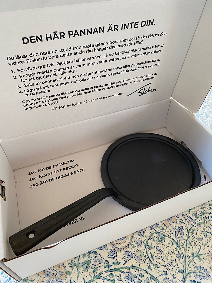 Årets riktiga gåva var annars en Lursta pannkakslagg. Nu hade förvisso maken önskat att jag skulle hålla ögonen öppna efter en liten gjutjärnspanna att steka ägg i. Denna tipsade min brorsa om efter att ha införskaffat en likadan. Nu ska nog mina pannkakor bli toppen, men även ägg stekes enligt utsago perfekt. Här hittar du länken till Arvet, som laggen heter. Skriver du upp dig för deras nyhetsbrev får du 10% rabatt på första köpet, så då blir frakten ”gratis”. (Hälsningar Snålis.)
