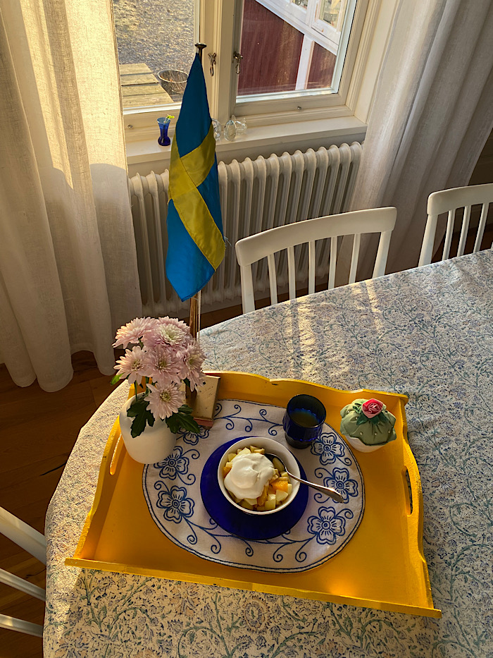 Födelsedagsflaggans snöre hade pajat, så jag fick plocka in den stora bordsflaggan från verandan. Jag kände inte för att springa upp och hämta björntråd och laga den innan uppvaktningen skulle ske.