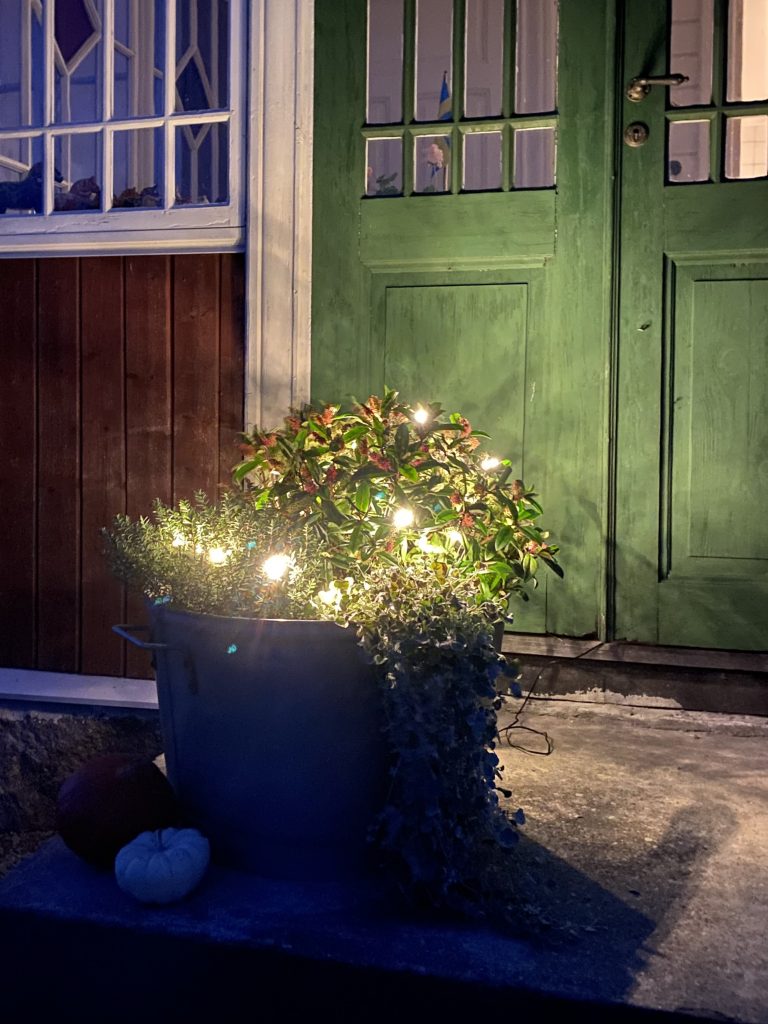 Vad fint med ljusslingan i krukan. Det lyser upp så fint om kvällen. Sådant behövs nu när det mörknar med med hast. Det känns som du är i fas med din trädgård också, bra.