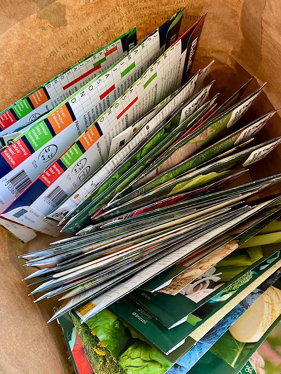 I kassen från Blomsterlandet har jag sorterat fröerna. Ikväll ska jag lägga dem i olika C4-kuvert med datum skrivet på. Detta är mitt absolut bästa tips då jag ger mig chansen att få alla fröer i jord i tid. Jag skriver påminnelser i telefonkalendern för att komma ihåg datumen. Dagarna är naturligtvis inte huggna i sten utan utgör ramarna för när fröerna ska ut ur sina påsar och få chans att börja jobba.