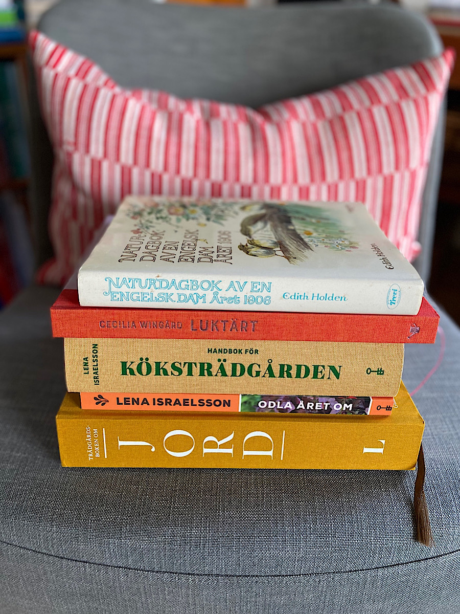 Detta är månadens litteratur. Högen har flyttat från fåtöljen i vardagsrummet till skrivbordet i arbetsrummet. Här bläddrar jag och funderar, planerar och påminner mig om sådant jag glömt. Naturdagbok av en engelsk dam året 1906 är möjligtvis den vackraste bok jag läst. Jag håller ögonen öppna för den på engelska också, men egentligen räcker ju den här. Jag bannar ibland mig själv för att prioritera tiden fel när jag läser denna dagbok. Å andra sidan är det absolut meningslöst att jämföra sig med någon annan, så på sin höjd får jag använda suget efter något annat som inspiration till kommande stordåd! Lena Israelssons böcker är bara fantastiska uppslagsverk och de böcker jag har haft störst nytta av efter de första åren med Sara Bäckmo som guide i trädgårdslandet. Cecilia Wingårds ljuvliga bok om luktärter har jag mer njutning än nytta av. Å andra sidan är hennes odlingsteknik av luktärter ”fool proof” och den finns också publicerad i boken. Jordboken påminner om att det är dags att plocka in bokashihinkarna igen. Jag har inte haft dem igång det senaste året vilket är synd då jag behöver all jordförbättring som tänkas kan.