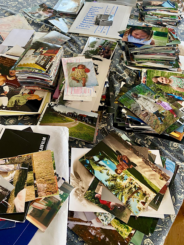 Jag rensar foton och memorabilia och sorterar med något slags mani. Känner att jag vill rida på vågen av lust för detta projekt och påminns om att det är så lätt att bara låta saker och ting vara när något blir överväldigande. Därför fortsätter jag. Dag efter dag. Digitala filer, negativ från olika platser som sorteras in i tidsordning, många tusen fotografier. En del åker i soporna. Solnedgångar och växter utan sammanhang. Suddiga bilder utan estetiskt eller dokumentärt värde. Sådant som var oviktigt då och oviktigt nu. Några stora semestrar samlas ihop för att få en egen plats i familjelådan.