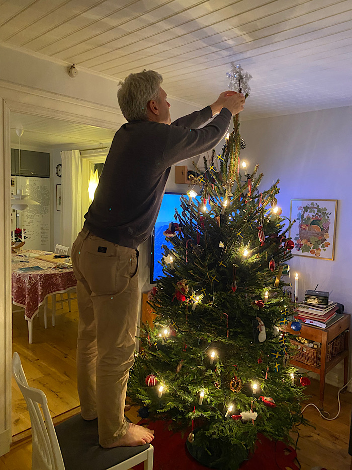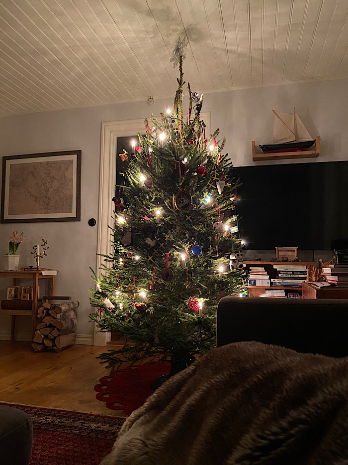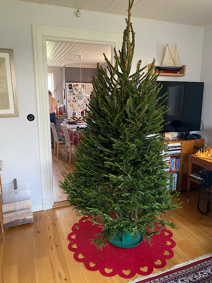 Familjetraditionen påbjuder att pappa tar sina barn och väljer gran. Utan barn hemma får pappa fixa själv. I år blev det en törstig miniversion av en Disneylik skapelse. Den luktar jätte-, jättegott i hela huset! ”Den har så mycket barr så det gör ingenting om den tappar lite”, konstaterade maken. Hahaha! Nu är den klädd med bara våra egna julgransprydnader. Döttrarna har tagit med sig sina, de som har samlats sedan de var bebisar. Sonens finns kvar här hemma, men jag tänkte att han får hänga upp sina om han vill när han kommer. Som traditionen påbjuder har jag sovit i soffan inatt, lika mysigt som vanligt. Jag är glad att rätt känsla har infunnit sig trots brist på både julväder och ätteläggar. Dags att swisha vidare! Hoppas att du har det bra.