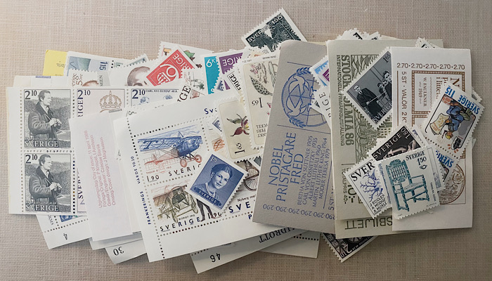 Samtidigt som jag höll på med mitt lilla sparsamhetsprojekt skickade jag en korsordstidning till mammas kusin i USA. Hon älskar att få dessa tidningar som både håller igång svenskan och hjärnan och jag brukar försöka skicka ett par, tre stycken per år. Det har dock blivit dyrare att betala portot än själva tidningen, så jag kände mig lite tjurig då jag kom hem efter att ha varit på ICA Nära och skickat iväg den där tidningen. Då kom jag ihåg min syrras tips att köpa frimärken billigt. Frimärkens värde består år från år och frimärken som är märkta Inrikes brev har det värde som dessa frimärken kostar samma dag som man skickar sin försändelse. Frimärken som inte har blivit använda kallas ”postfriska” och säljs både på auktion och på diverse försäljningssidor. Själv gick jag genast in på Tradera och letade upp några olika försäljningar av just postfriska frimärken och hittade en auktion som skulle avslutas om några timmar. Frankeringsvärde 800 kr, ingen hade budat. Eftersom Tradera har infört ett köparskydd så jag skulle kunna skicka tillbaka paketet om jag blev lurad bestämde jag mig för att testa. Jag satte ett maxbud på 350 kr (inklusive porto på 44 kr och köparskyddet på 15 kr skulle det innebära halva priset på varje frimärke) och glömde auktionen. Senare samma dag fick jag meddelande om att jag hade vunnit på försäljarens utgångsbud, 250 kr, eftersom ingen annan varit med och budat! Det innebar att jag betalade 309 kr kronor för frimärken värda 800 kr. Många av dessa frimärken har lite lägre valörer, så det kommer att bli ett pusslande för att få ihop rätt värde när jag ska skicka något. Det ska bli mig ett riktigt nöje!