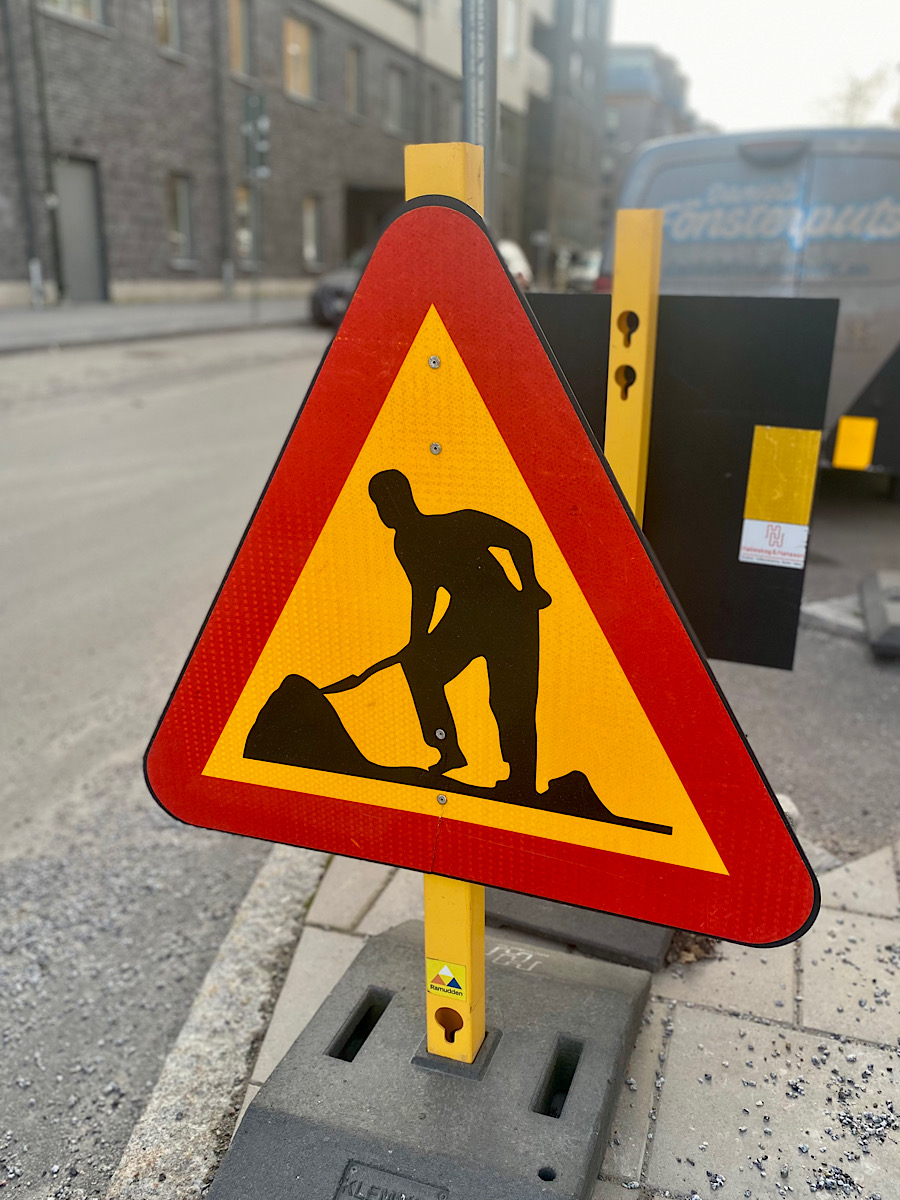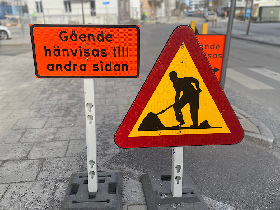 Det hade inte varit dumt med dessa två skyltar att hänga runt halsen i det här skedet. Tänk att bara ha medarbetare runt omkring mig. Folk som jag kan lita på, som ”håller hastigheten”, vet vad de pysslar med, inte stjäl mina redskap och maskiner, är fokuserade på samma bygge som jag och bidrar till en trygg arbetsplats ”Gående” = alla som bara ska förbi, som inte är investerade i mig, inte är intresserade av diskussioner, inte har förmåga eller vilja att utvecklas tillsammans med mig. Tanken lockar, men som människa behöver man kunna hantera att göra även ganska intensivt arbete med sig själv utan att kunna inhänga arbetsplatsen.