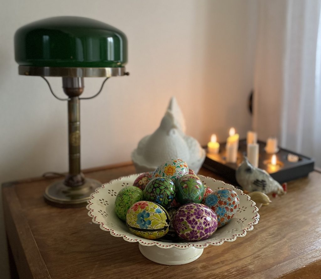 För mig som är som jag är känns det viktigt och roligt att följa årets skiftningar också inomhus genom att rota lite i skåp och lådor för att ändra om lite i inredningen. Den stora hönan (godisgömman) i vitt opalglas är min favorit. Hon börjar värpa först i påskveckan, men jag hör nog att maken lyfter på locket för att kolla läget mest varje dag tills det verkligen händer… De vackra, målade äggen köpte jag på World Market i SLC då vi bodde i Orem. De gör mig orimligt glad! Har olika favoriter varje år.