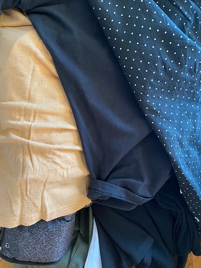 Hur tänker jag då? Jag har en hög med Sellpy-kläder (tyvärr har de lång tid från att man skickat in kläderna tills de publiceras, så jag försöker ligga liiite i framkant för säsongen), en hög med sådant som behöver lagas/noppas, en hög med kläder som ska skänkas till Pingstis eller någon vän och sedan finns slänghögen till kläder som av någon anledning inte längre går att använda. Tekniken att vända på galgen för att se om jag använt ett plagg sedan senaste rensningen är mycket hjälpsam. I samband med den här rensningen går jag också igenom den lista jag har i telefonen där jag skriver upp om det är något plagg jag saknar eller önskar. Med allt detta sagt har jag ett fåtal plagg med affektionsvärde som får vara kvar trots att jag inte längre använder dem. De har jag dock en egen låda till på garderobsgolvet. Jag tyckte det var så synd att mamma inte hade ett enda roligt plagg från sina olika faser i livet, det hade varit kul att ha några sådana kvar.