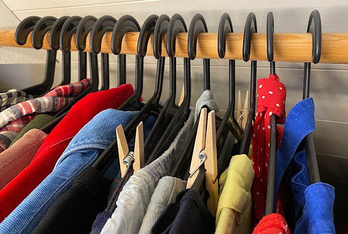 Hur tänker jag då? Jag har en hög med Sellpy-kläder (tyvärr har de lång tid från att man skickat in kläderna tills de publiceras, så jag försöker ligga liiite i framkant för säsongen), en hög med sådant som behöver lagas/noppas, en hög med kläder som ska skänkas till Pingstis eller någon vän och sedan finns slänghögen till kläder som av någon anledning inte längre går att använda. Tekniken att vända på galgen för att se om jag använt ett plagg sedan senaste rensningen är mycket hjälpsam. I samband med den här rensningen går jag också igenom den lista jag har i telefonen där jag skriver upp om det är något plagg jag saknar eller önskar. Med allt detta sagt har jag ett fåtal plagg med affektionsvärde som får vara kvar trots att jag inte längre använder dem. De har jag dock en egen låda till på garderobsgolvet. Jag tyckte det var så synd att mamma inte hade ett enda roligt plagg från sina olika faser i livet, det hade varit kul att ha några sådana kvar.