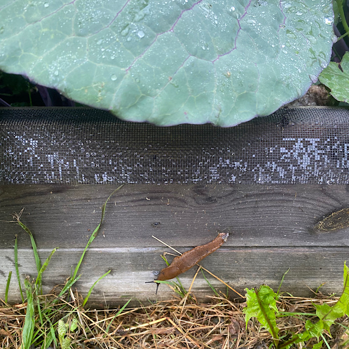Syrran skickade ett tips om hur man kan stänga ute mördarsniglarna från sina odlarlådor med takfotsnät. Jag sätter alldeles för mycket kål i mina kållådor vilket gör att det blir svårt att leta efter oinbjudna gäster, men det syns såklart när de smaskar i sig av allt det läckra. Nu plockade jag bort kålnätet på ena lådan, det är lite hål i det och kålfjärilar sågs ändå fladdra omkring innanför nätet. Maken häftade fast takfotsnät enligt Instagramtipset på alla tre kållådorna och några av de andra i trädgårdslandet så får vi se hur effektivt det är. Det var ett tag sedan jag letade sniglar bland grödorna, så innan projektet påbörjades plockade jag bort tio feta exemplar i experimentlådan. Igår, dagen efter monteringen av takfotsnätet, hittade jag två stora till. Jag tror dock att jag bara hade missat dem dagen innan. Det senaste dygnet har det regnat en hel del, så morgonen inleddes med en snigelletarrunda. Två feta sniglar var på väg ner för lådkanten med oförrättat ärende, men i själva lådan hittade jag bara en liten rackare. Kanske hade den forcerat takfotsnätet på väg in, men den kan också ha gömt sig under de andra sökningarna. Isåfall är det här en revolutionerande uppfinning! Vi kan inte undvika att sniglarna kommer in på tomten från sina gömslen, men kan vi stoppa dem från lådorna har vi verkligen vunnit mycket.