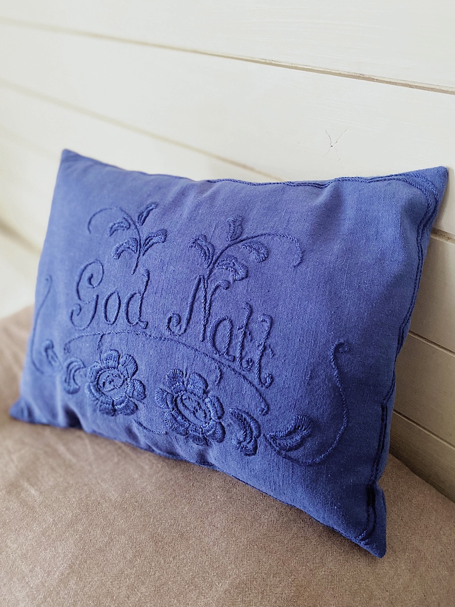 Ett vitbroderi kunde jag tyvärr inte få riktigt fint trots behandling med diverse blekmetoder, så jag bestämde mig för att färga in det. Den färg som var tillgänglig var blå eftersom jag skulle fräscha upp några grejer till Bredavik, så blått fick det bli. Jag färgade in det förra våren för att bli ett projekt att förfärdiga till HEMSLÖJDstemat och sedan blev det bara liggande tills för två veckor sedan då jag äntligen fick tummen ur. Jag beställde en perfekt lagom stor kudde från Jotex och sedan var det bara att mäta upp och skära till.