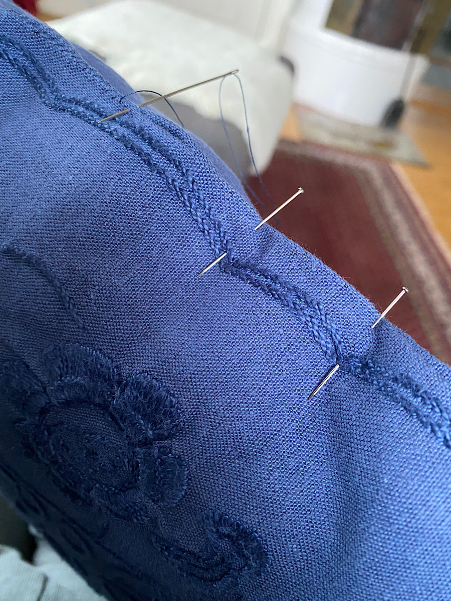 Jag bestämde mig för att sy igen kudden med maskin och lämnade en 15 cm mitt i sömmen ”i botten” så kudden kunde knös in. Sedan sydde jag igen öppningen för hand. Det blir lite krångligare om den ska tvättas eftersom man får plocka upp de handsydda stygnen, men så får det vara.