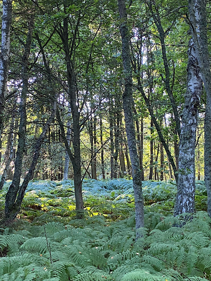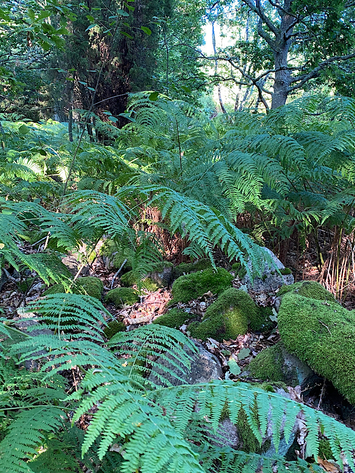 Ormbunksskogen här hade jag aldrig upplevt. Vi gick upp för grusvägen för att spana in huset som är till salu här ute. Skumpig väg till bebyggelse, men stor potential till att få det som man vill och bara ett fåtal grannar. Huset ger samma vibbar som föräldrahemmet under min tid i grundskolan. Precis en sådan rutig fåtölj som står i storstugan hade vi där, liksom hörnskåpet i furu. Furupanel i gillestugan. Jag har fortfarande inte riktigt tagit till mig 70-talets estetik. Jo, i textilier ibland och i vårt arbetsrum har jag ju klövertapeten som var poppis då och som satt i mitt flickrum. Den är dock per definition jugend (1890-1920), en stil som jag gillar desto mer. Tack för möjlighet till avsvalkning! Jag undrar vad det egentligen är som gör att vi antingen älskar eller ogillar värme?