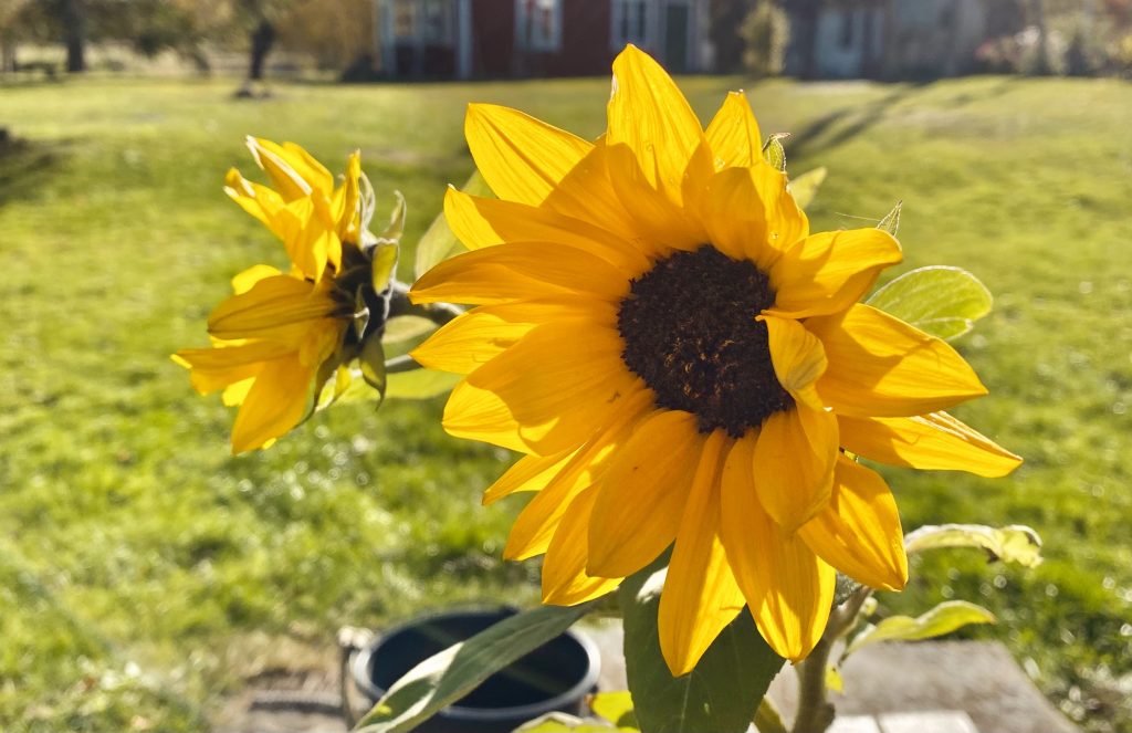 Hösten finns inte bara i lönnar. Bakom ladan har vi våra läskiga aspar som skrapar mot taket där. De är också imponerande vackra. Kanske ska vi ansa några av grenarna? Vi får se. Något som absolut inte är beständigt är krassen, men fin är den. Vi har nu flera kraftiga och yvigt blommande exemplar på lite olika ställen i trädgården. Den här gulliga i lådan med rödkål och broccoli tycker jag om. Efter en tuff sommar visade det sig att min krasse bara ville ha höst, precis som jag.