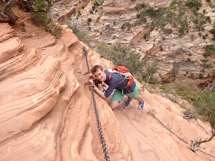 Den enda person du får se i detta inlägg är sonen då han och maken hajkade upp på Angels Landing i Zions nationalpark. Jag kan bara säga att jag och döttrarna hittade på annat den dagen och höll oss upptagna för att inte tänka på vad de höll på med. Fyyyy så läskigt! Det har skett flera dödsfall här, men enligt maken och sonen kände de sig trygga hela tiden. Dåligt väder och oförsiktighet är inte bra förutsättningar för någon, jag gissar att dessa varit bidragande orsak till olyckliga fall.