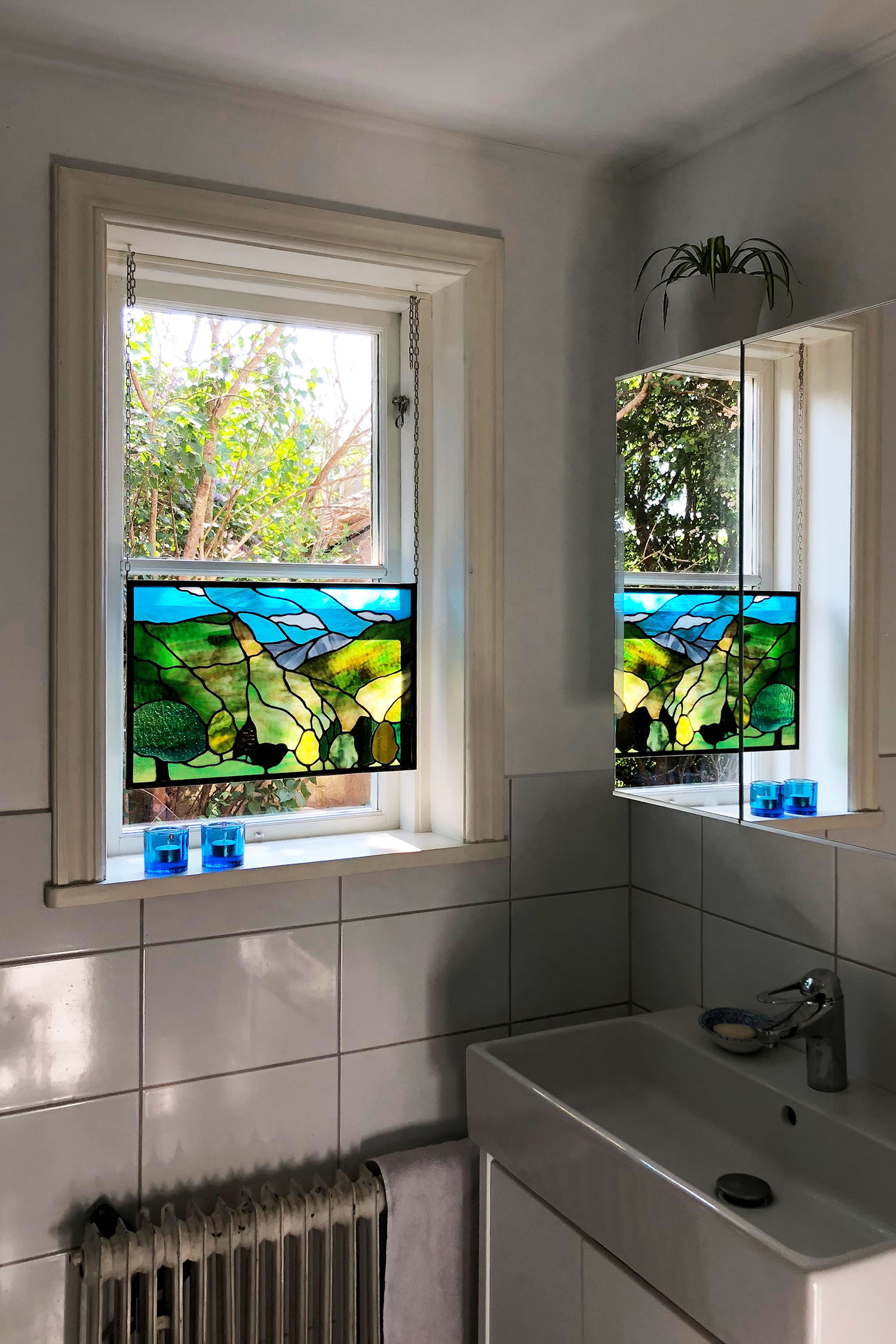 Kanske kan du också förstå varför jag blev så tacksam över grannarnas avskedsgåva till oss? Ett par av mina vänner visste hur mycket jag älskar blyglasfönster och bergen. De lät en blyglaskonstnär skapa detta fönster med (ett stiliserat) motiv av vår utsikt. Denna personliga och omtänksamma gåva får vi nu njuta av varje dag. Snacka om fullträff! (2019 målade jag om elementen, tack och lov. Visst gillar jag att bo i ett hus med karaktär, men skabbiga element var inte så himla kul.) Hoppas att du har gillat att möta ”mina” berg.