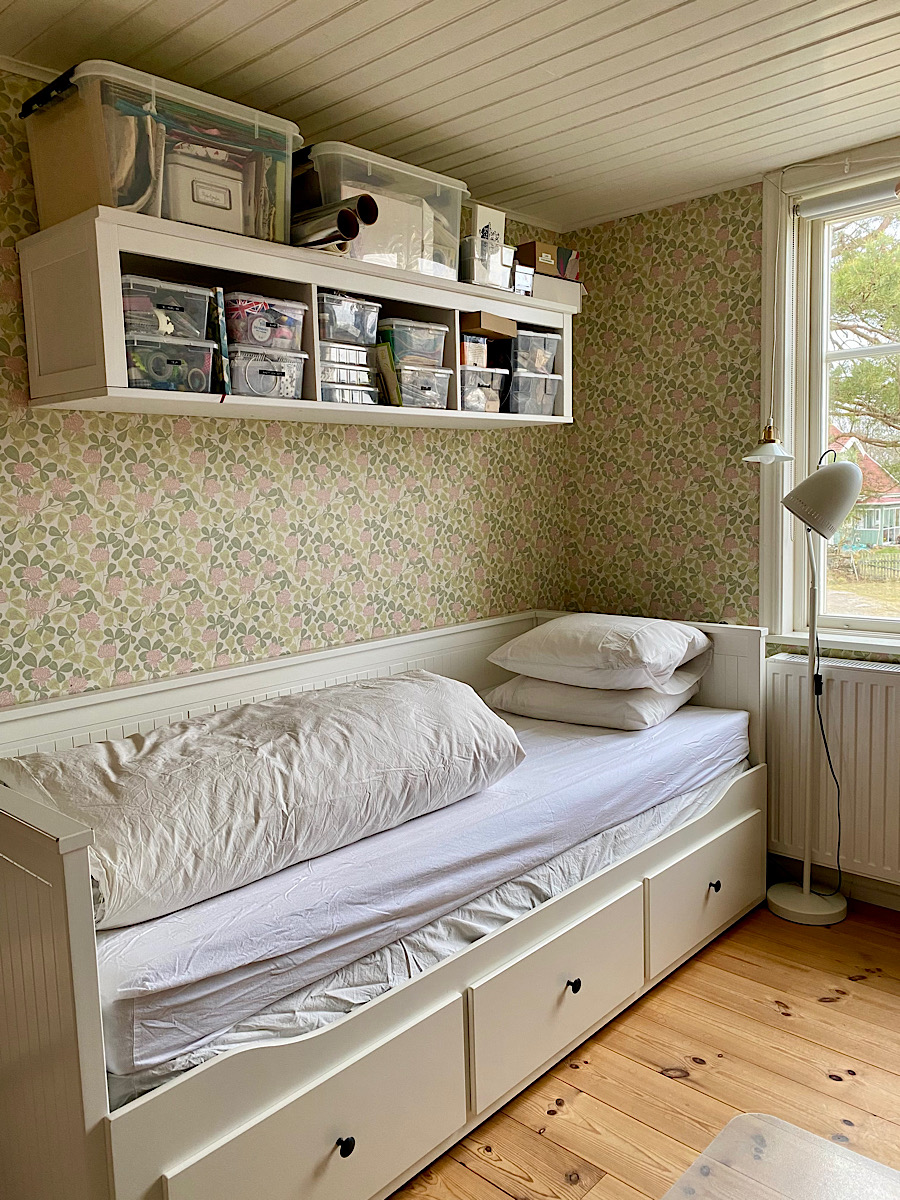 När jag lägger lakan i garderoben eller bäddar iordning till gäster kan jag inte låta bli att tänka på mammas tvillingsyster. Hennes ordningssinne har alltid inspirerat mig. Jag är för evigt fascinerad av hennes linneskåp och får något slags njutning av att se räta linjer och rätt typ av textil på rätt plats. Inbjudande sovplatser till gäster likaså. Till helgen firar vi min morbrors 80-årsdag och min kusin och några i hans familj kommer att övernatta här. Jag älskar att fixa och dona, gillar att bädda och se till att allt är iordning vare sig det är våra barn eller några andra gäster som kommer. Den som får sova i ”syrummet” får skönaste sängen och säkert en massa extra syre med tanken på växthushyllan därinne. Skrivbordet är flyttat för att göra plats till hyllan så det ser lite märkligt ut, men så får det vara. Den som sover under snedtaket i Gurras skrubb får kanske den skönaste sömnen, det är otroligt bra sovenergi där.