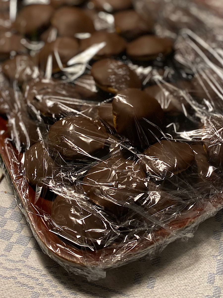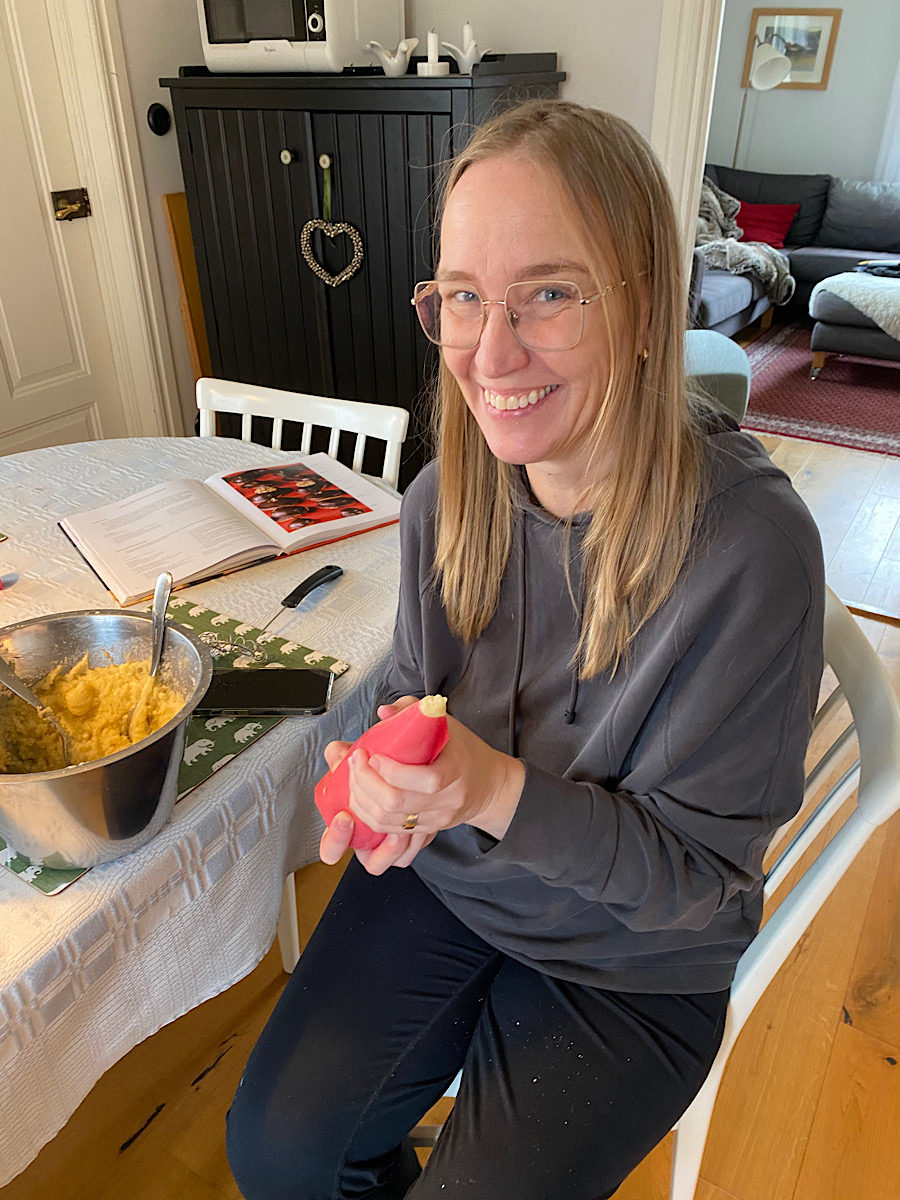 Inför födelsedagsfirandet hade syrran lovat att göra biskvier. Efter lunch kom hon och vi gjorde gemensamma ansträngningar med henne som arbetsledare. Jag må älska att baka, men just biskvier har vår son blivit expert på och lärt sig alla knep av sin moster. Jag fick därför agera hjälpreda den här gången. Så mysigt att prata och prata och prata och tjuvsmaka på den absolut godaste smörkräm jag ätit någon gång. Jag gillar quick fixes och behöver bli puttad på för att komma ihåg att det också har sitt värde att anstränga sig liiite mer gällande somligt. Den här gången ville syrran att vi skulle göra Jan Hedhs franska smörkräm från 277 sorters kakor. Det var något om att koka sockerlag till 117°C, använda riktig vaniljstång och skålla/mala mandeln till bottnarna så man inte råkar ut för dålig mandelmassa med aprikoskärnor i. Vad kan jag säga? Det blev sjukt gott. Att ett halvt kilo smör idag kostar 79 kronor är en annan historia. Hjälp! Ja, se, detta blev ett blogginlägg utan röd tråd men med mycket Monna.