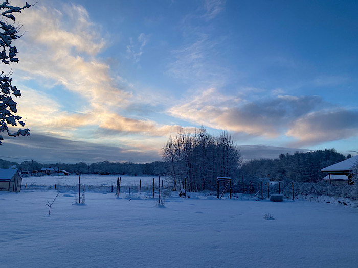 Det blå ljuset – så vackert! Tänk så stilla trädgårdslandet och växthuset ligger. Man ser iallafall de fina grönkålsplantorna, de har verkligen varit till glädje den här vintern. Jag njuter av min planttantssemester och har inte börjat drömma om nya odlingar än. Jag behöver min lilla paus och njuter av att vara extra inomhuspysslig under de här månaderna. Det ska fortsätta vara kallt och vi ska visst få mer snö också. Lika bra att gilla läget! Och det var väldigt skönt då jag tog mig ut en stund idag. Måtte nu bara mördarsniglarna frysa rumpan av sig!