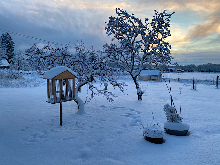 Det har snöat till och från i flera dygn, men i morse hade det snöat klart. Hela trädgården såg ut som en orörd vinterdröm! Snö upplevs helst i samarbete med barn och med rätt klädsel. Denna morgon hade jag varken det ena eller det andra tillgängligt, men jag fick betvinga oviljan eftersom jag behövde ge de vilda fjäderfäna lite mat. Hönsen vägrar att komma ut ur hönshuset. De ogillar snön starkt, men värper iallafall sina ägg (om än med större mellanrum). Jag förstår dem. Maken har tagit på sig att ombesörja deras vård. Vattnet har alltid frusit på morgonen då vi har haft under nollan ett bra tag, så isklumpen ska stjälpas ut och nytt vatten ska hällas upp innan det är dags för dagens portion med foder. Både Birgit och Jenny mår finfint och kommer alltid glatt och äter, men se snön vägrar de sätta sina små fötter i.